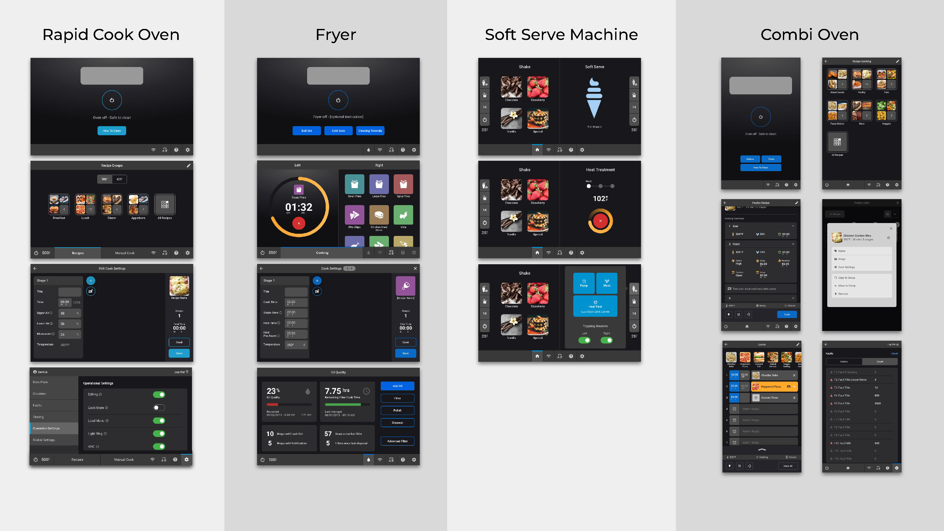 From manual cooking settings to animated timers, a comprehensive design system works for interfaces across many devices. The parent company has provided standards and templates for all companies that are in use today on pizza ovens, friers, combi ovens, soft-serve machines and more!